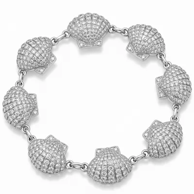 The Seashell Bracelet captures the ethereal beauty of the ocean depths in radiant 18KT white gold. Intricately designed seashell motifs are linked together, each segment meticulously paved with exceptional VVS diamonds. This sophisticated piece drapes elegantly on the wrist, offering a luxurious interpretation of coastal elegance. It is a stunning statement accessory perfect for collectors of fine nautical jewelry.