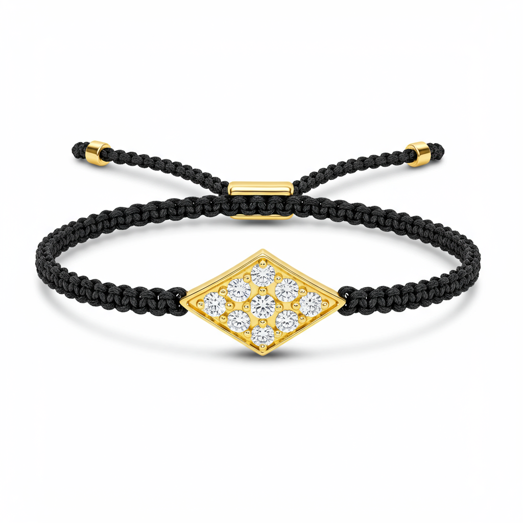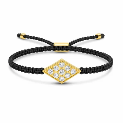 A contemporary design combining delicate 18KT yellow gold craftsmanship with a durable black textile thread. This versatile bracelet features a small central gold element, often personalized or diamond-studded, offering subtle luxury for daily wear. The adjustable sliding knot ensures a perfect fit for any wrist size, blending modern minimalism with timeless material elegance. It is an effortless piece designed to stack beautifully or stand alone as a sophisticated statement.