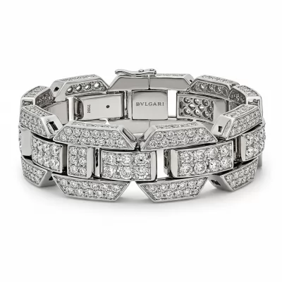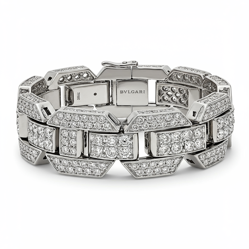 The JewelGravity bvlgari bracelet is a masterpiece of architectural precision and fluid design. Crafted in luminous 18KT white gold, this piece features interlocking elements set with brilliant-cut diamonds, creating a continuous band of scintillating light. Its bold yet comfortable silhouette pays homage to classic Roman luxury and modern Italian craftsmanship. This statement bracelet offers an undeniable aura of sophistication, perfect for high-fashion wear or significant milestones.