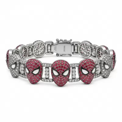 The Spiderman Bracelet is a striking tribute to heroism, meticulously crafted in 18KT white gold, fusing iconic design with high luxury. It features dynamic link motifs intricately detailed with micro-pave set diamonds, capturing the iconic web-slinger aesthetic with unparalleled brilliance. This statement piece utilizes only VVS clarity diamonds to ensure maximum fire and sparkle across its surface. Secured with a streamlined invisible box clasp, this bracelet provides both safety and a seamless visual flow, balancing high-fashion aesthetics with beloved pop culture iconography.