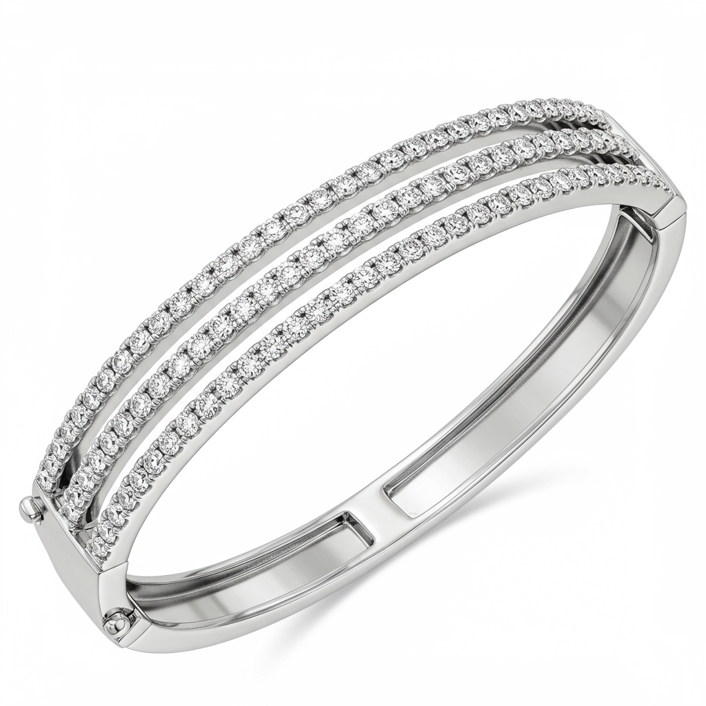 This exceptional bangle bracelet is meticulously crafted from 18KT white gold, showcasing relentless brilliance across its substantial surface. It features multiple rows of exquisitely set round brilliant diamonds in a secure micro-pave setting. The bracelet's elegant profile and robust clasp ensure both comfort and durability, making it suitable for both daily wear and grand occasions. This piece is the epitome of timeless luxury, designed to capture and reflect light from every angle. It represents unparalleled craftsmanship and enduring style.
