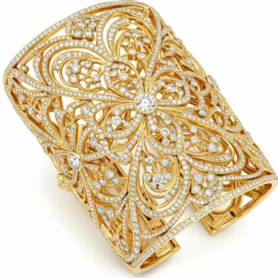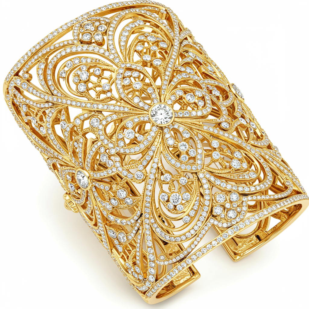The Bracelet Mehndi Design is an exquisite tribute to traditional henna artistry, translating delicate floral and geometric patterns into precious metal. Crafted in luminous 18KT yellow gold, this wide cuff features complex filigree and meticulous diamond setting work. Every curve echoes the ephemeral beauty of mehndi, offering a timeless piece of wearable art. It wraps the wrist in unparalleled luxury and detailed craftsmanship, perfect for celebratory occasions.