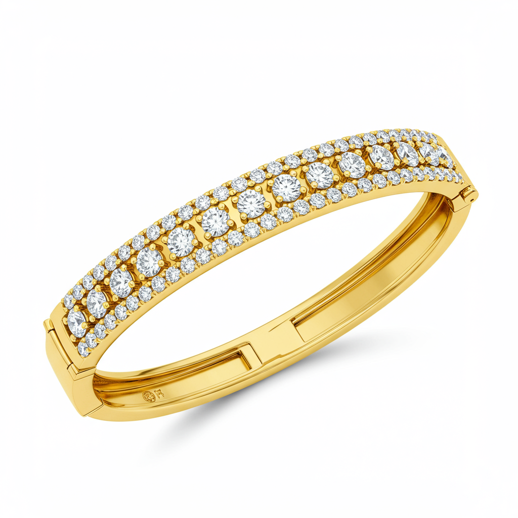 This elegant bangle bracelet captures timeless luxury, crafted from radiant 18KT yellow gold. Its substantial, smooth profile ensures both comfort and visual impact on the wrist. Adorned with a continuous line of brilliant VVS diamonds, this piece offers exceptional sparkle and sophistication. The high-quality construction and secure hinge mechanism guarantee secure wear, making it perfect for daily elegance or major events.