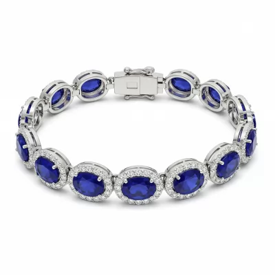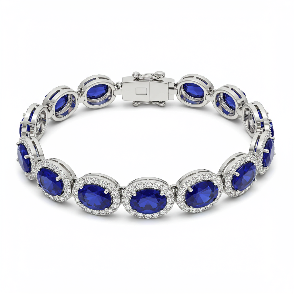 The 'blue stone bracelet' defines timeless luxury, featuring a sequence of seven captivating oval blue sapphires set in lustrous 18KT white gold. Each vibrant gemstone is meticulously bordered by brilliant micro-pave diamonds, enhancing its depth and sparkle. This link bracelet drapes gracefully around the wrist, providing a substantial yet comfortable fit. It is the perfect statement piece for any sophisticated occasion, promising heirloom quality and exquisite craftsmanship.