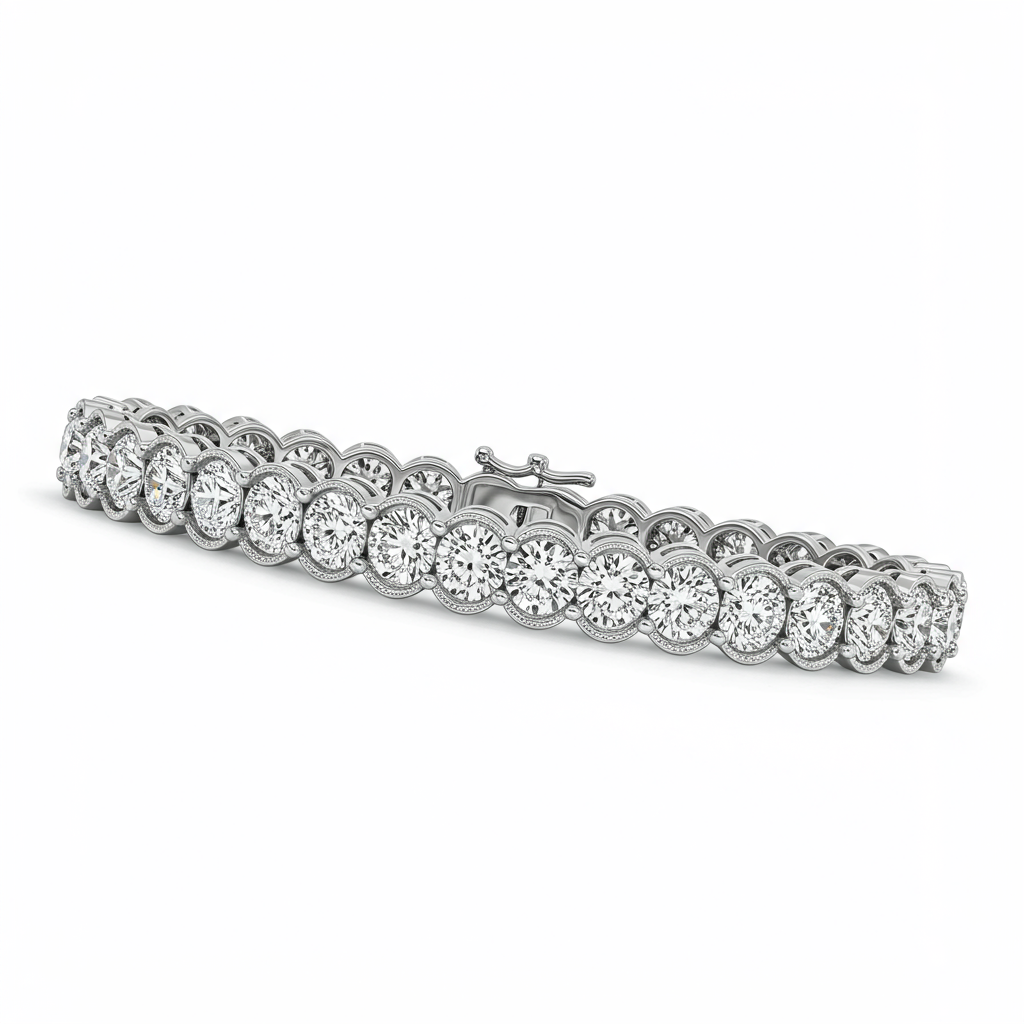 The 'bracelet app' Diamond Line Bracelet epitomizes timeless luxury and unwavering brilliance. Crafted in lustrous 18KT white gold, this piece features 75 individually set, brilliant round diamonds secured by a secure clasp. Each stone boasts VVS clarity and G color, ensuring unparalleled fire and sparkle across the wearer's wrist. This highly flexible design makes it the perfect statement accessory for formal events or sophisticated everyday wear, representing ultimate craftsmanship.
