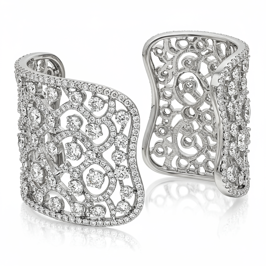 The 'bracelet bra' articulated cuff embodies structural elegance and modern luxury. Crafted in radiant 18KT white gold, its geometric framework is entirely blanketed in brilliant-cut diamonds. The sophisticated, flexible design ensures unparalleled comfort and a dynamic fit, conforming beautifully to the wrist. This statement piece captures light from every angle, making it the definitive accessory for high-fashion events. It represents a flawless convergence of technical mastery and opulent design.