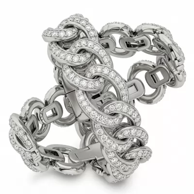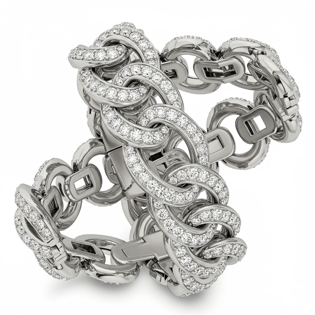 The 'bracelet making kit' design is an architectural marvel of articulation, featuring intricate, custom-engineered links that ensure fluidity and exceptional comfort on the wrist. Crafted in luminous 18KT white gold, this piece redefines modern luxury through precise geometry. The entire surface is blanketed in 1.85 carats of brilliant VVS round diamonds, micro-set to maximize fire and scintillation. This statement bracelet offers a dazzling complexity, making it an essential piece for connoisseurs of intricate high jewelry.