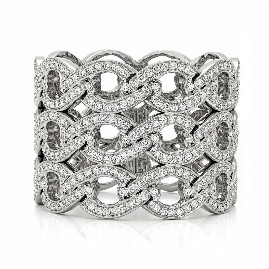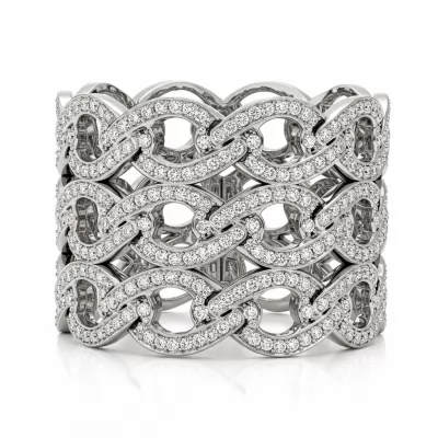 The Chanel-inspired cuff bracelet is a masterpiece of geometric precision, meticulously crafted in radiant 18KT white gold. Featuring intricate interlocking elements fully paved with brilliant VVS diamonds, this piece captures sophisticated luxury and architectural elegance. Its bold yet ergonomic structure provides a commanding presence on the wrist, perfect for high fashion occasions. This stunning design ensures maximum light reflection from every angle, delivering unparalleled sparkle and glamour.
