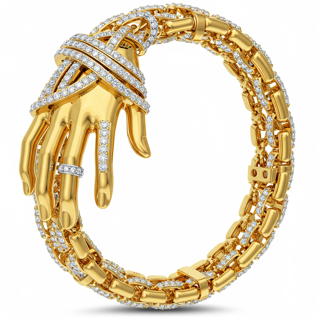 The Gold Hand Bracelet is a masterpiece of fluid design, connecting a delicate wrist chain to an elegant finger loop. Crafted in radiant 18KT yellow gold, this piece moves with effortless grace, enhancing the natural beauty of the hand. It is meticulously adorned with brilliant round diamonds set in subtle pave formations, capturing light from every angle. This signature accessory offers a stunning blend of traditional grandeur and contemporary finesse, perfect for the modern connoisseur.