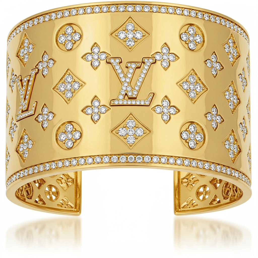 The 'lv bracelet' cuff is a masterpiece of modern luxury, meticulously crafted in radiant 18KT yellow gold. This statement piece features intricate detailing, fully pave-set with exceptional VVS clarity diamonds that capture light from every angle. Its hinged structure ensures a comfortable and secure fit, embodying both elegance and enduring strength. This bracelet serves as a timeless emblem of sophisticated style and artisanal excellence.