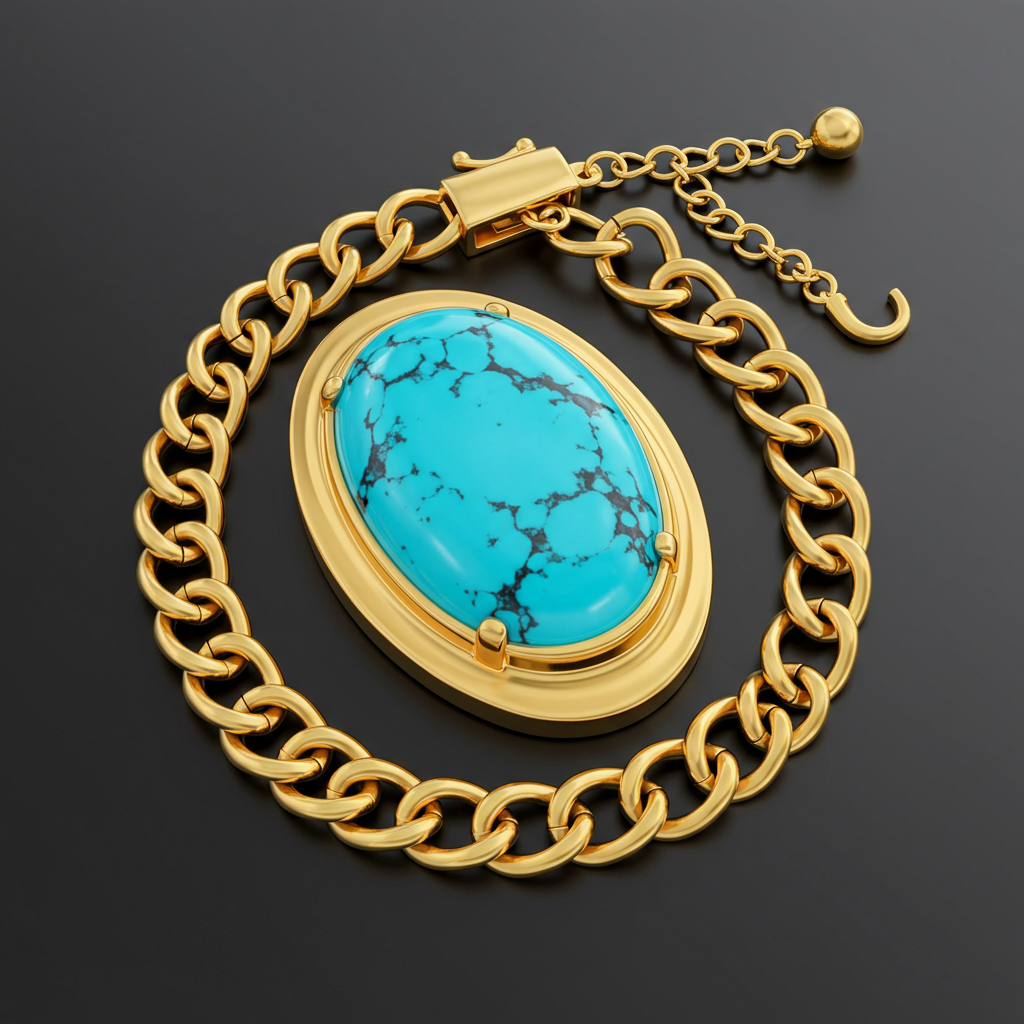 The Salman Khan Firoza Bracelet captures the essence of iconic style, marrying raw charisma with timeless elegance. Crafted in heavy 18KT Yellow Gold, this traditional chain link bracelet features a striking, large oval cabochon Turquoise (Firoza). The intense blue of the natural gemstone provides a powerful contrast to the radiant gold setting. This piece is a bold statement, symbolizing protection and strength, suitable for daily wear or special occasions.