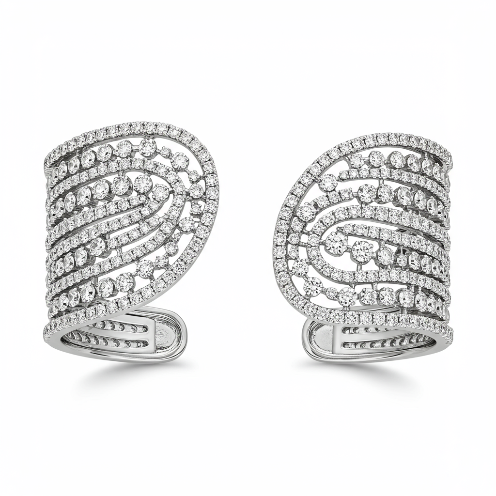 This exquisite cuff bracelet embodies modern luxury, meticulously crafted in radiant 18KT white gold. The design features sweeping, organic lines paved entirely with scintillating VVS natural diamonds, ensuring unmatched brilliance. Its ergonomic form provides a comfortable fit while serving as a bold statement piece suitable for both gala events and sophisticated daily wear. This bracelet is a timeless testament to superior craftsmanship and elegance, celebrating feminine strength and grace. The superior setting highlights the exceptional quality of the stones.