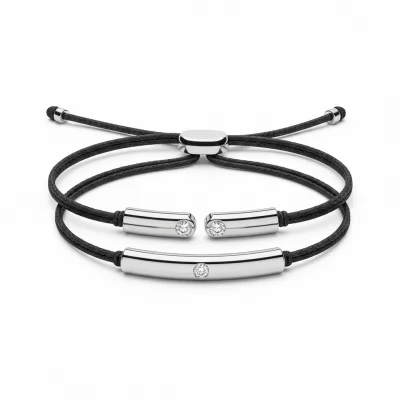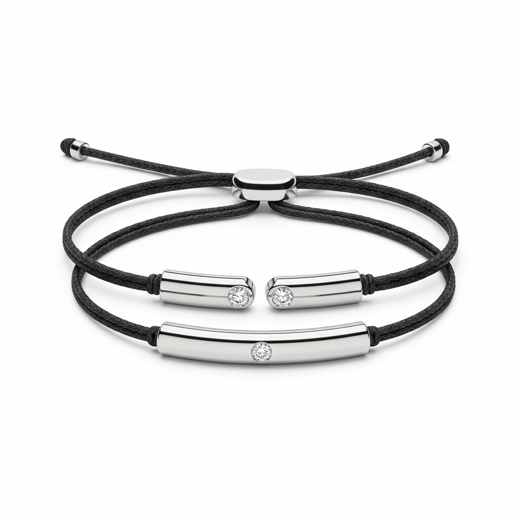 Symbolize your enduring connection with this sophisticated set of Long Distance Couple Bracelets. Crafted in polished 18KT white gold, each bracelet features a minimalist cylindrical bar subtly accented with two brilliant VVS clarity diamonds. The design utilizes a durable, adjustable cord, ensuring comfort and a perfect fit for both partners, regardless of the miles separating them. This set is a modern testament to love and commitment, fusing high luxury with everyday wearability.