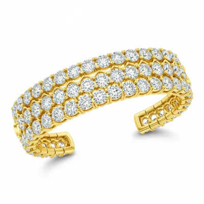 The Tanishq-inspired gold bracelet is a magnificent display of craftsmanship and elegance. Crafted in rich 18KT yellow gold, this flexible cuff wraps the wrist with luxurious comfort. It features a dazzling array of brilliant diamonds set to maximize light return and sparkle. This statement piece is perfect for formal events or as a sophisticated everyday luxury accessory.