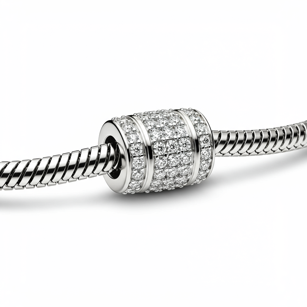 The Pandora-style charm bracelet offers endless personalization possibilities, crafted from exquisite 18KT white gold. This signature piece features a secure barrel clasp delicately accented with pave diamonds, ensuring both security and subtle luxury. Its polished finish and robust construction make it an ideal foundation for daily wear and cherished memory collection. Start your journey of personalized luxury with this timeless and beautifully crafted piece. The threaded stations allow charms to remain perfectly positioned.