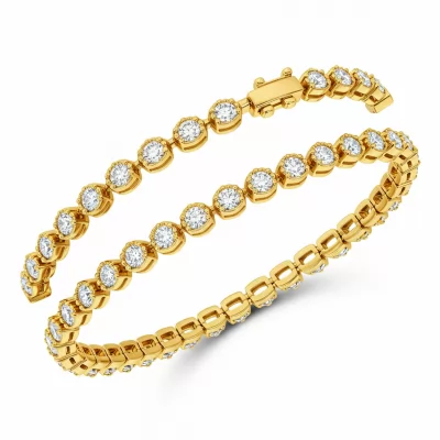 This exquisite Diamond Line Bracelet is crafted in radiant 18KT yellow gold, embodying timeless elegance suitable for daily wear or special occasions. The flexible design ensures supreme comfort and graceful movement on the wrist. It features a continuous stream of individually set, brilliant round diamonds, totaling 3.50 carats. Secured with a robust hidden clasp and safety latch, this piece represents a blend of sophisticated design and enduring quality, making it a perfect heirloom.
