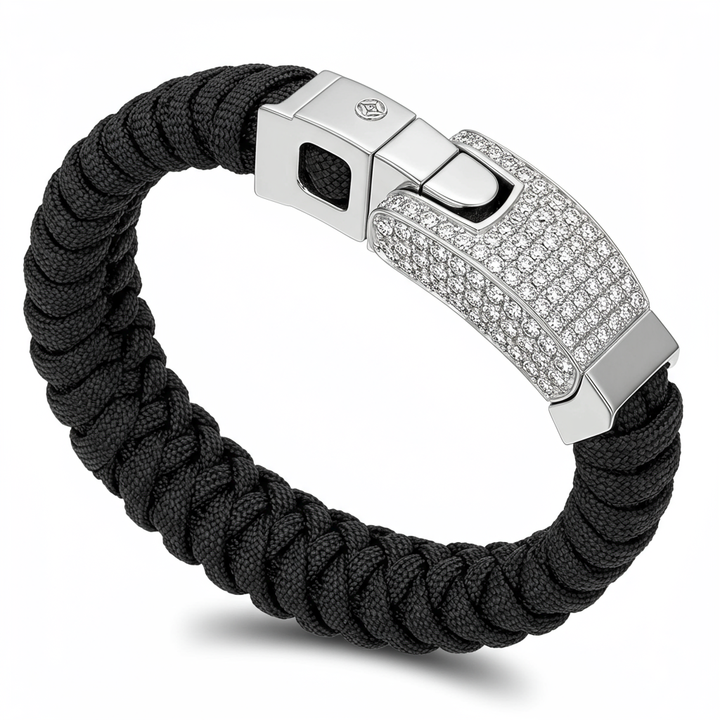The Paracord Bracelet merges robust utility with high-end luxury. Featuring a heavy-duty, finely woven nylon cord, this piece is anchored by a sophisticated 18KT white gold clasp. The clasp is meticulously micro-pave set with brilliant VVS diamonds, creating a striking contrast between the resilient textile and the dazzling precious metal. This exceptional bracelet offers a distinctly modern aesthetic, perfect for the discerning individual who values both style and durability. It serves as an everyday statement piece suitable for all occasions.