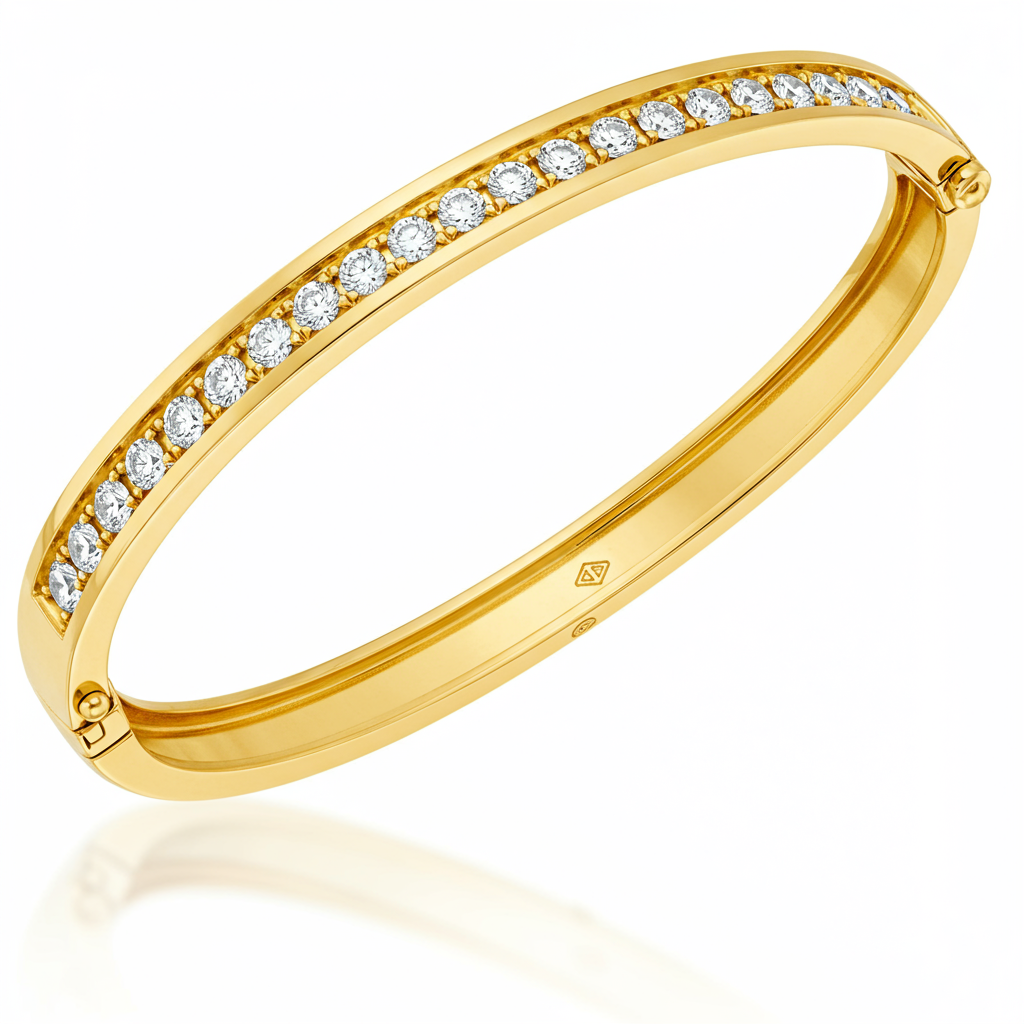 The iconic 'cartier bracelet women' design is reimagined in lustrous 18KT yellow gold, offering timeless elegance and sophisticated luxury. This meticulously crafted bangle features a clean, curved silhouette, secured by a seamless locking mechanism. It is subtly adorned with brilliant-cut VVS diamonds, ensuring dazzling sparkle with every movement. A symbol of enduring commitment and opulent style, this bracelet is a perfect centerpiece for any high-end jewelry collection.