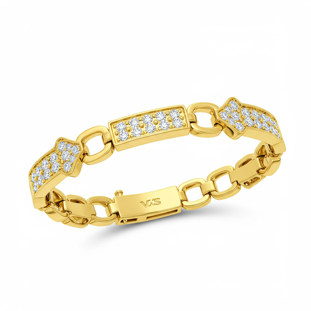 This exquisite 14k yellow gold charm bracelet offers timeless elegance and versatility, perfect for personalizing with future keepsakes. Crafted with substantial interlinking loops, the bracelet features five integrated stations subtly accented with brilliant pave diamonds. Its polished finish catches the light beautifully, making it an ideal foundational piece for any luxury jewelry collection. The secure lobster clasp ensures comfortable and confident daily wear.