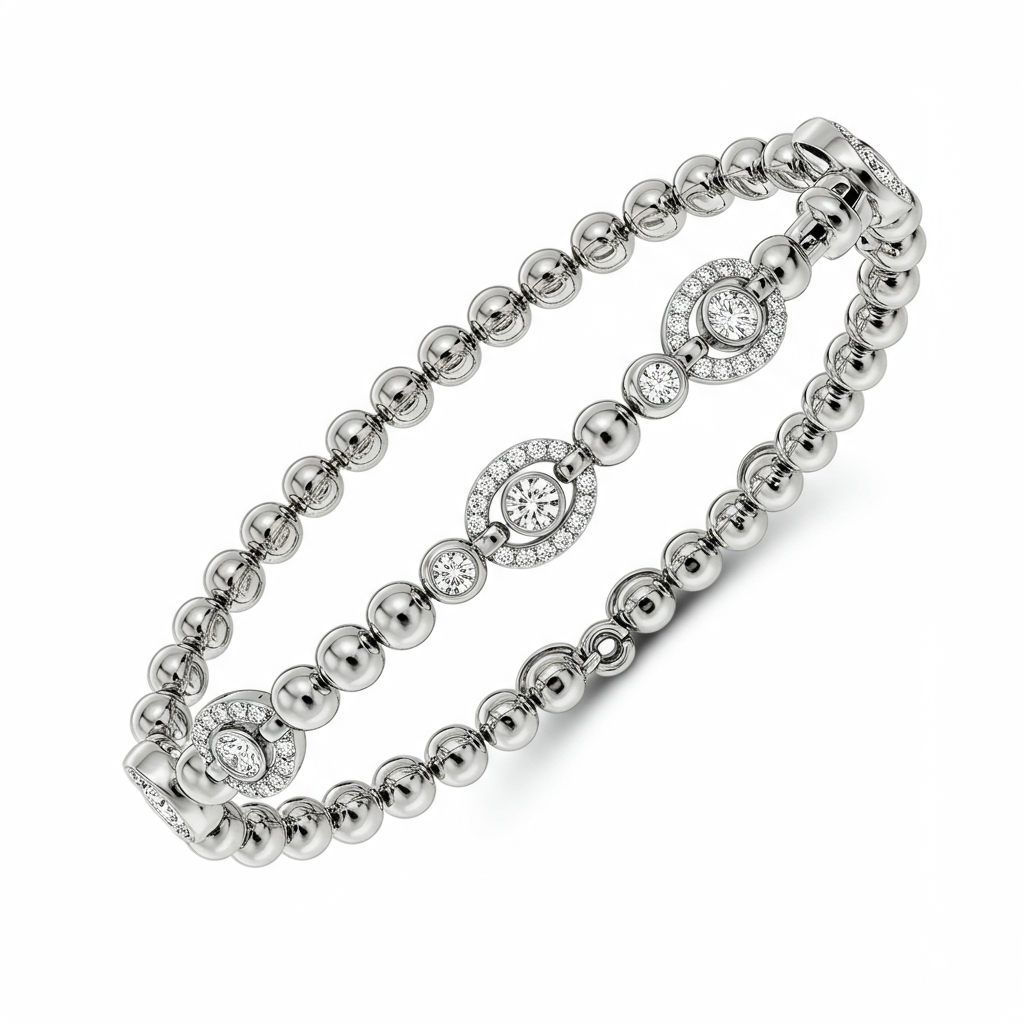The Beads Bracelet is an exquisite blend of modern design and classic elegance. Crafted in shimmering 18KT white gold, this piece features perfectly spherical precious metal beads interspersed with brilliant pavé diamond accents. Its fluid structure drapes beautifully on the wrist, making it a versatile statement accessory. This bracelet captures and reflects light dynamically, ensuring a dazzling presence suitable for any grand occasion.