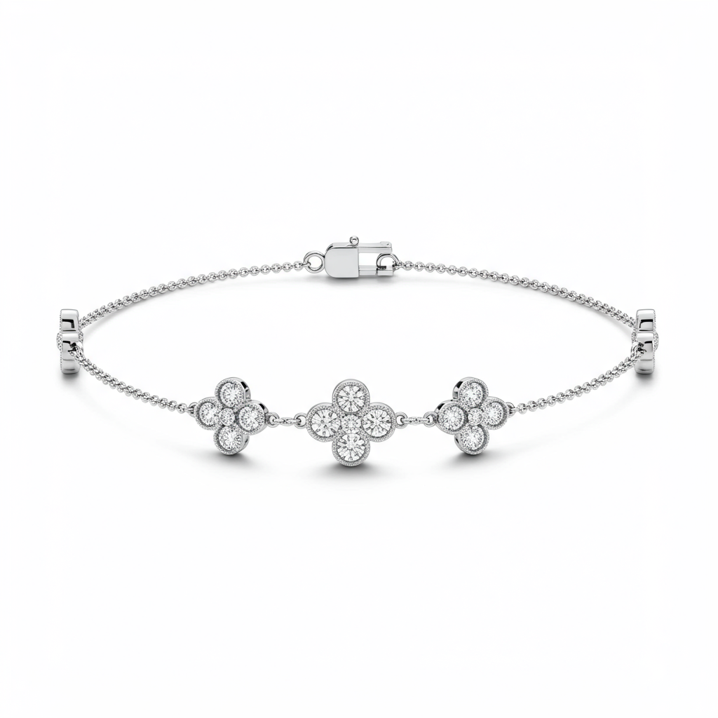 The Clover Bracelet is an exquisite celebration of luck and timeless elegance. Crafted in radiant 18KT white gold, this delicate chain features multiple station settings shaped like iconic four-leaf clovers. Each clover motif is meticulously set with brilliant VVS diamonds, creating an irresistible sparkle that catches the light with every movement. This piece transitions effortlessly from daywear sophistication to evening glamour, making it a perfect luxurious statement.