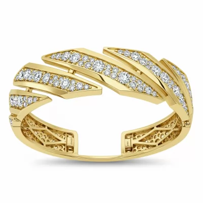 This Givenchy-inspired cuff bracelet embodies modern sophistication and timeless structure. Crafted in radiant 18KT yellow gold, its bold, ergonomic silhouette wraps the wrist with grace. The edges are meticulously paved with 1.25 carats of brilliant VVS round diamonds, adding a subtle yet spectacular sparkle. This statement piece transitions effortlessly from professional environments to elegant evening wear, defining luxury through architectural design and exceptional craftsmanship.