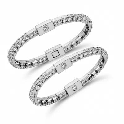 The Bond Touch Bracelets represent a profound connection, meticulously crafted in radiant 18KT white gold. Each bracelet features a delicate chain secured by an innovative magnetic clasp, subtly accented with a precise alignment of VVS round brilliant diamonds. Designed for both aesthetic beauty and meaningful symbolism, this pair serves as an elegant testament to an unbreakable emotional link. Its streamlined, modern architecture ensures comfortable wear, making it a perfect gift for commemorating unique relationships.