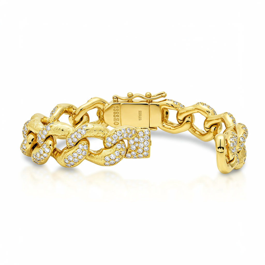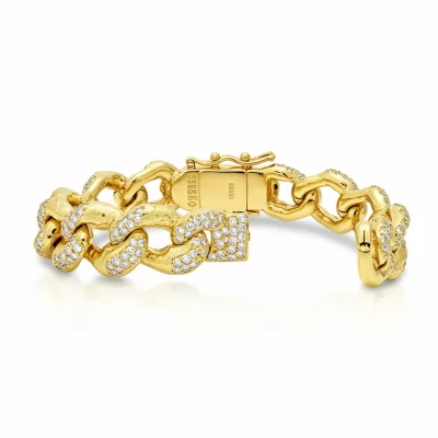 The nugget bracelet epitomizes rugged luxury, crafted in radiant 18KT yellow gold. Its surface features organically textured, polished gold nuggets seamlessly linked together, creating a bold, masculine profile. Each nugget is meticulously accented with micro-pave set VVS diamonds, adding a captivating brilliance to the substantial design. This piece is a true statement of enduring style and masterful craftsmanship, built for the contemporary connoisseur.