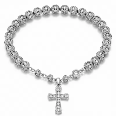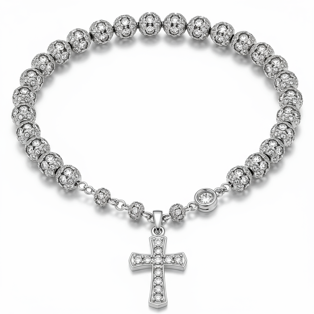 The Rosary Bracelet is a profound expression of faith rendered in exquisite luxury. Crafted in radiant 18KT white gold, this piece features a delicate chain interspersed with perfectly polished diamond-set beads. A miniature pave cross charm dangles gracefully, catching the light with every movement. This elegant bracelet balances spiritual significance with contemporary high-jewelry design, making it an heirloom piece for daily wear.