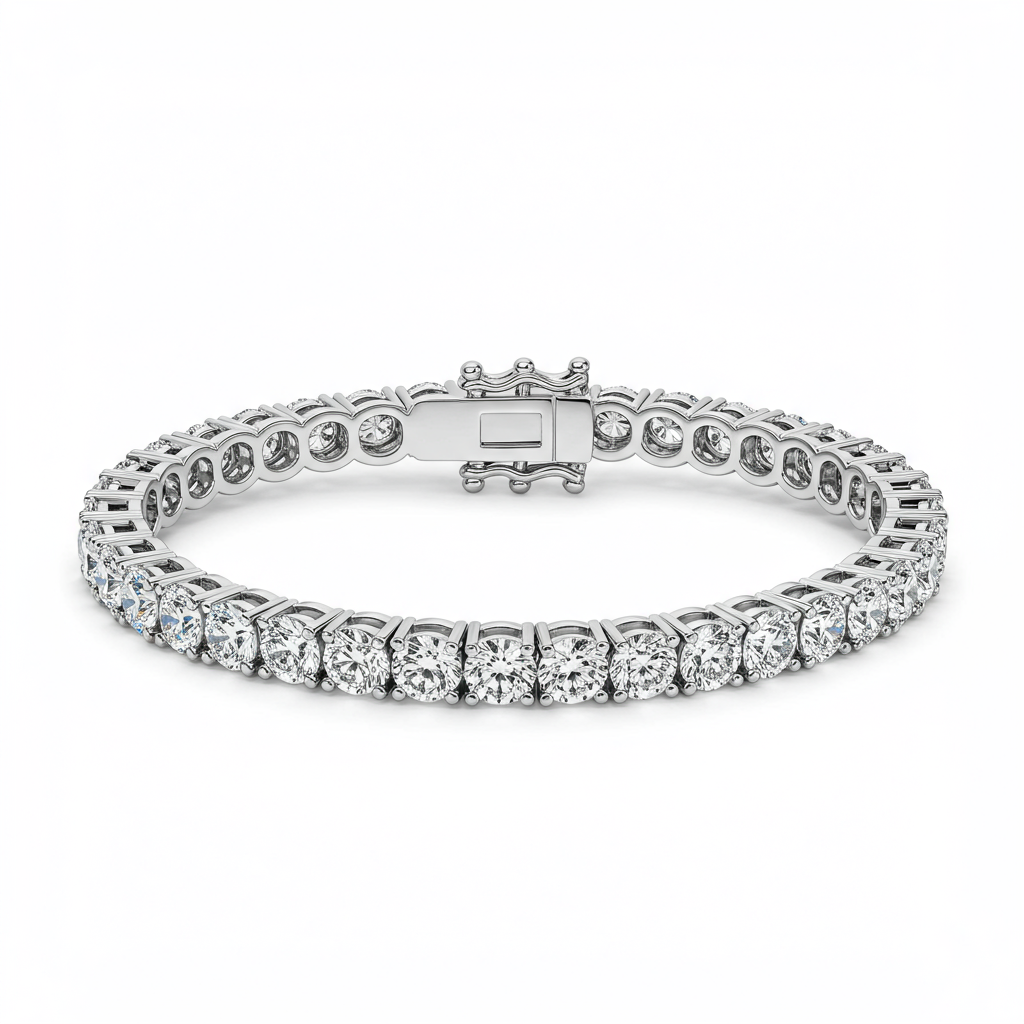 The quintessential diamond tennis bracelet, redefined in exquisite 18KT white gold. This luxurious piece features a continuous line of perfectly matched, brilliant round VVS diamonds, set in meticulous four-prong baskets. Each stone is precisely aligned to maximize light return, ensuring unparalleled sparkle with every movement. A secure box clasp with dual safety catches guarantees confident and comfortable wear, making this a timeless centerpiece for any collection.