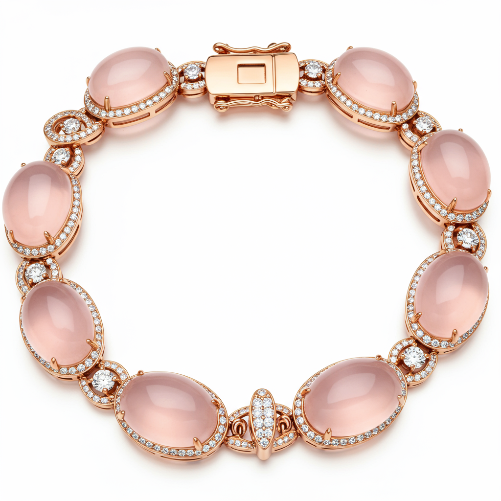 The Rose Quartz Link Bracelet embodies gentle sophistication and feminine grace. This exquisite piece features seven large, highly polished oval rose quartz stones, meticulously set within rich 18KT rose gold bezels. Known traditionally as the stone of unconditional love, the soft pink hue offers a calming and elegant appeal. The links are further accented by delicate micro-pave diamonds, enhancing the overall shimmer and prestige. This luxurious accessory is designed for timeless elegance and cherished wear.