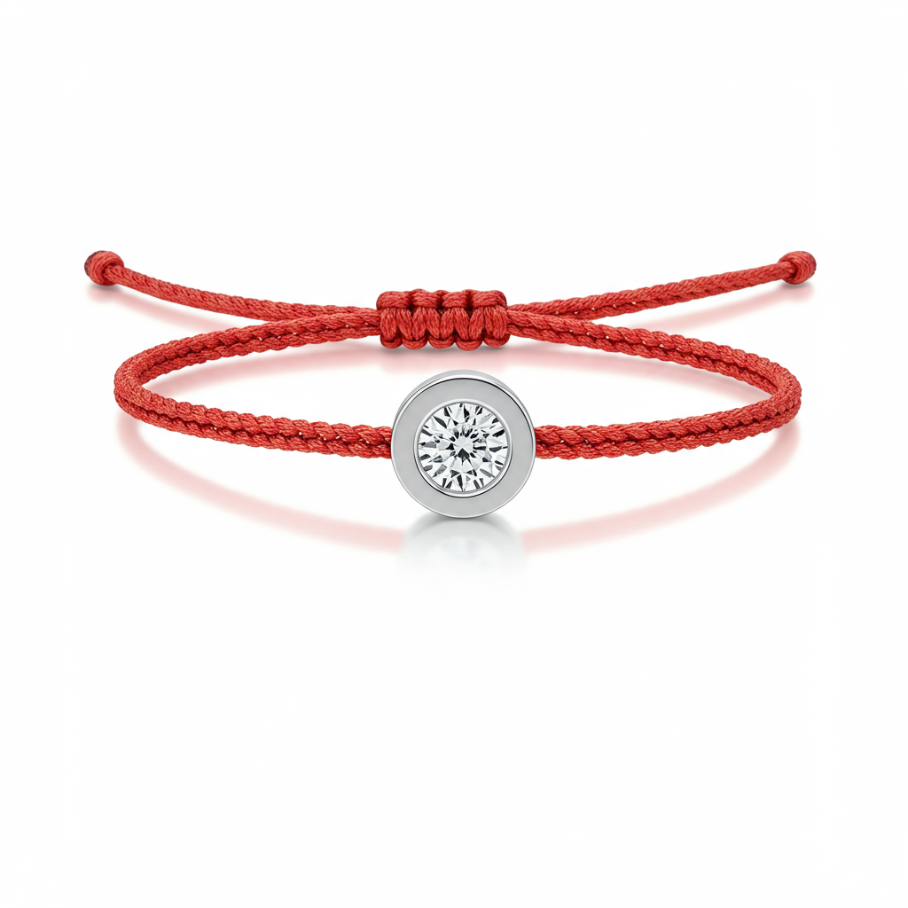 The 'bracelet string' blends modern minimalism with timeless luxury. Featuring a single, brilliant round diamond meticulously set in 18KT white gold, this piece captures light with every movement. The diamond component is suspended on a durable, adjustable red string, offering personalized comfort and a contemporary aesthetic. This design is perfect for daily wear, providing a subtle yet powerful statement of elegance and refinement.