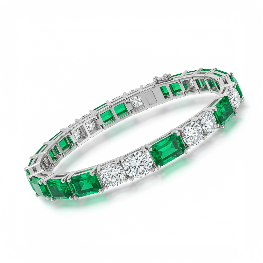 The Emerald Cascade Bracelet is a masterpiece of timeless luxury, featuring a stunning alternating pattern of vibrant, deep-green emeralds and brilliant white diamonds. Crafted in flawless 18KT white gold, this line bracelet drapes elegantly around the wrist, offering continuous sparkle and rich color. Each stone is meticulously prong-set, showcasing their exceptional clarity and fire. This heirloom-quality piece serves as the ultimate statement accessory for gala events or formal celebrations.
