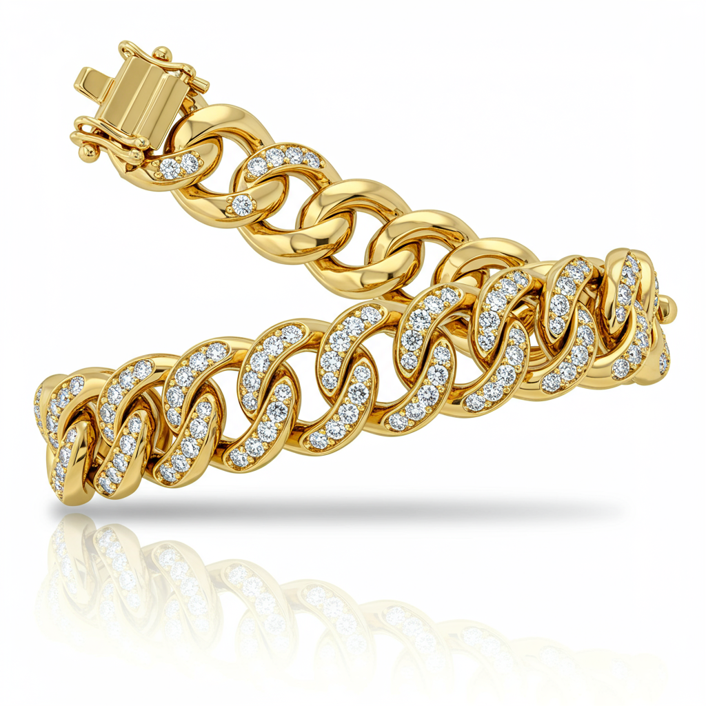 The 'James Avery' inspired link bracelet redefines classic charm with unmatched luxury. Crafted in radiant 18KT yellow gold, this substantial piece features organically shaped links meticulously set with brilliant-cut diamonds. Each VVS diamond, exhibiting exceptional G color, captures the light with dazzling intensity. This heirloom-quality bracelet makes a bold, yet sophisticated statement, perfect for the discerning collector.