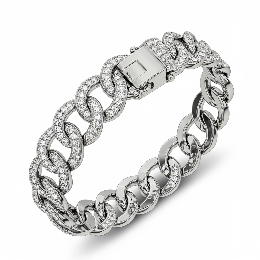 This distinguished men's link bracelet embodies robust sophistication, crafted meticulously in 18KT white gold to achieve a luxurious silver-tone aesthetic. Each substantial link is micro-pave set with brilliant VVS round diamonds, lending a subtle yet undeniable sparkle to the piece. Designed for the modern gentleman, its heavy weight and flawless craftsmanship ensure enduring quality and a powerful statement. This bracelet is the perfect complement to both sharp business attire and elevated casual wear, signifying true luxury.