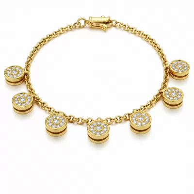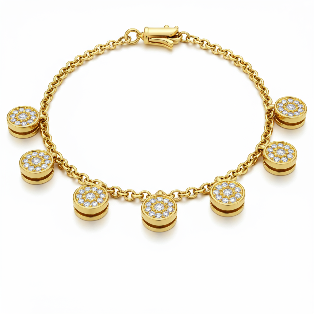 This exquisite charm bracelet is meticulously crafted in radiant 18KT yellow gold, offering a timeless foundation for everyday luxury. Five diamond-encrusted charms, secured by sturdy links, catch the light with every movement. Featuring brilliant-cut VVS diamonds, this piece seamlessly blends classic elegance with modern wearability. It is designed to be a treasured heirloom, symbolizing precious milestones and memories.