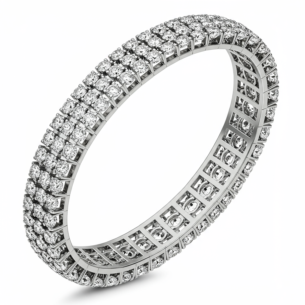 This exquisite flexible diamond bangle encapsulates timeless luxury, meticulously crafted in radiant 18KT white gold. A continuous line of 100 perfectly matched VVS round diamonds creates an unbroken stream of brilliance around the wrist. Engineered for comfort and effortless elegance, this bracelet utilizes a secure yet flexible framework, making it ideal for daily wear or grand occasions. It is a defining piece that symbolizes enduring sophistication and masterful jewelry artistry.