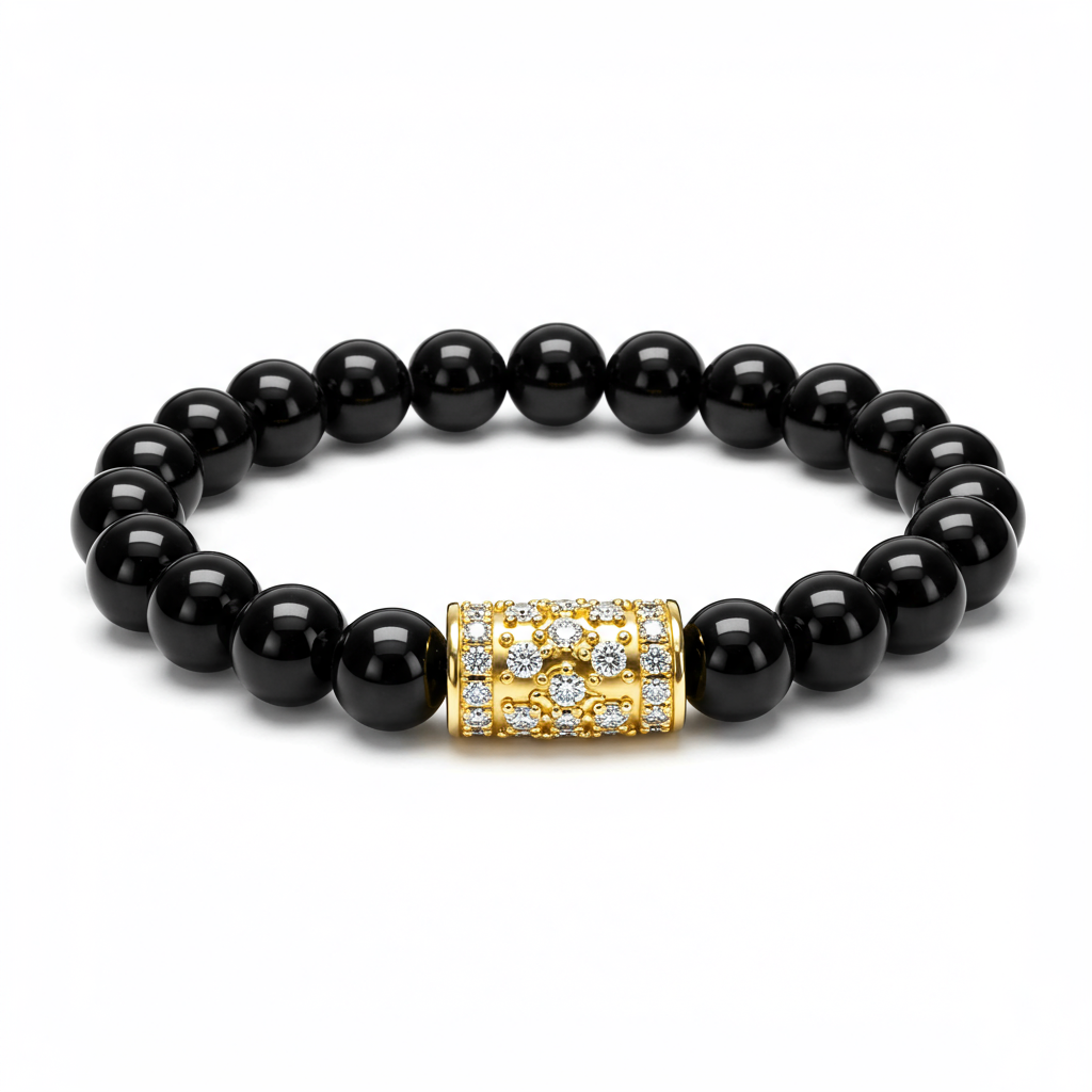 This elegant feng shui bracelet seamlessly blends traditional symbolism with high-end luxury, crafted in radiant 18KT yellow gold. Featuring perfectly spherical obsidian beads, this piece is accented by a central geometric charm pavé-set with VVS brilliant round diamonds. Designed to attract wealth and positive energy, it serves as both a powerful talisman and a sophisticated statement accessory. Its flexible construction ensures comfortable, daily wear while maintaining exceptional aesthetic integrity.