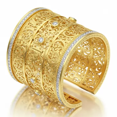 The Mexican Heritage Cuff Bracelet embodies timeless artisan skill, crafted in lustrous 18KT Yellow Gold. This wide bracelet features intricate, deeply engraved geometric patterns inspired by traditional Latin American motifs. Flawlessly set VVS G-H diamonds accent the edges, catching light with every movement and emphasizing the craftsmanship. A truly magnificent statement piece designed for unparalleled elegance, this cuff fuses cultural history with modern high-jewelry standards.