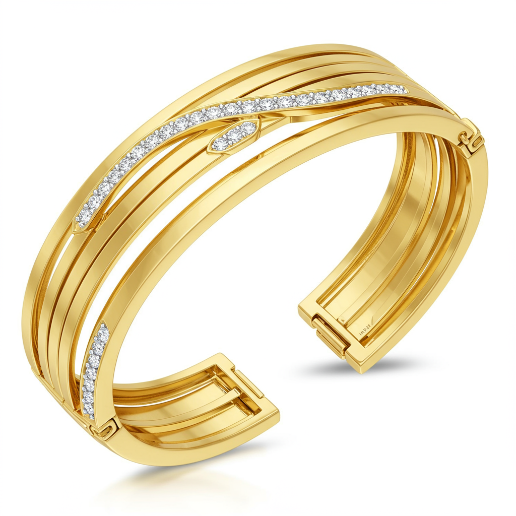 The Tory Burch Inspired Bangle captures effortless sophistication with its signature logo detailing and smooth, polished lines. Crafted in radiant 18KT yellow gold, this piece offers a seamless blend of modern design and timeless elegance. A subtle array of VVS accent diamonds illuminates the defining structure, adding a delicate sparkle to the cuff. This bracelet serves as a luxurious statement, perfect for stacking or wearing as a striking solo piece, embodying high-fashion sensibility.