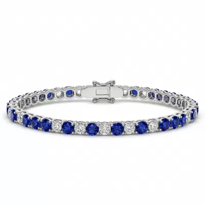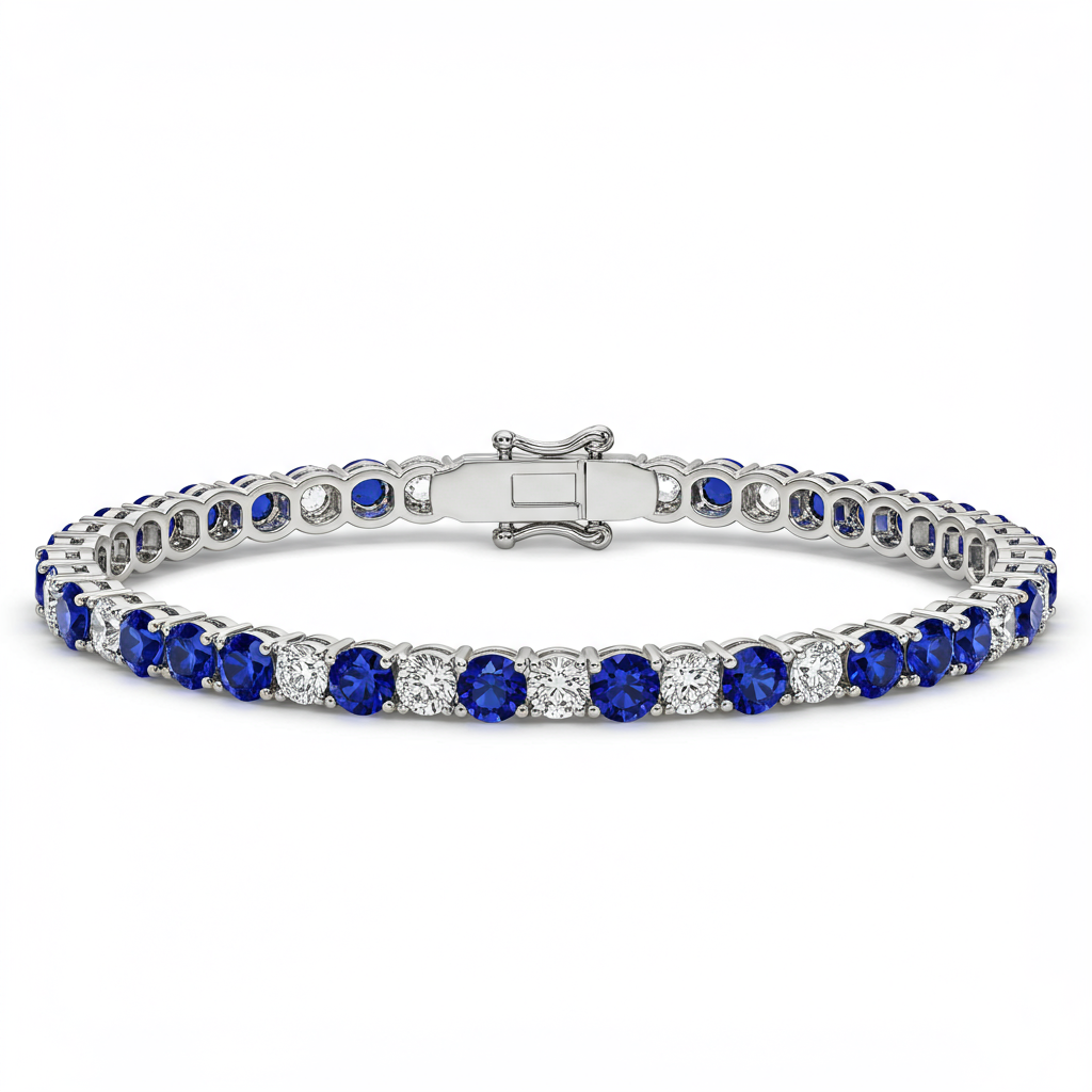 This exquisite tennis bracelet features a continuous stream of vibrant, round Ceylon Blue Sapphires alternating with brilliant white diamond accents. Set meticulously in lustrous 18KT white gold, the design achieves a striking balance between classic elegance and vivid color. Its flexible articulation ensures ultimate comfort and flow on the wrist. This piece is a true statement of luxury, perfect for major celebrations or as an heirloom acquisition.