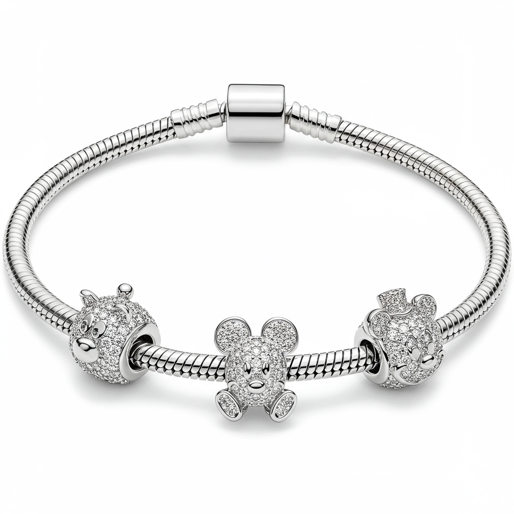 The enchanting Disney Pandora Bracelet captures beloved magic in exquisite 18KT white gold. This classic snake chain design is complemented by three highly detailed, pavé-set Disney-themed charms. Crafted with meticulous attention to detail, the bracelet showcases brilliant VVS G-H diamonds, creating a sparkling tapestry of luxury and whimsy. It is the perfect heirloom piece, blending nostalgic charm with modern fine jewelry elegance.