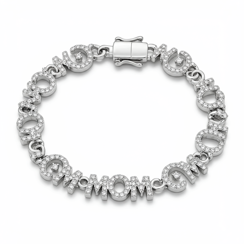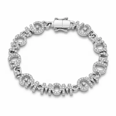 The 'Mom Bracelet' is a stunning tribute to motherhood, crafted in lustrous 18KT white gold. This delicate link bracelet features elegant script charms meticulously paved with brilliant VVS diamonds. Designed to be cherished for a lifetime, it serves as a beautiful and luxurious reminder of an enduring bond. It is the definitive heirloom piece, perfect for gifting on any special occasion.