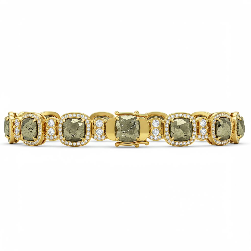 The Pyrite Link Bracelet is a testament to understated luxury, featuring highly polished, geometric pyrite stones set in rich 18KT yellow gold bezels. Each pyrite segment, known for its metallic luster and golden hue, is meticulously linked to create an exceptional drape around the wrist. Complementing the bold structure, small VVS diamonds accent the connecting links, adding a refined sparkle. This piece seamlessly merges contemporary design with ancient geological beauty, making it a powerful statement accessory.