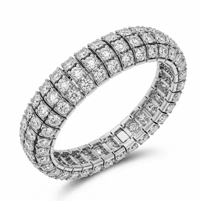 The 'rubber band bracelets' redefine flexible luxury, blending industrial inspiration with impeccable fine jewelry craftsmanship. Crafted in polished 18KT white gold, this innovative design offers supreme comfort and stackability, moving seamlessly with the wearer's wrist. A continuous line of VVS G-H diamonds, meticulously set, captures and reflects light brilliantly from every angle. This piece is perfect for layering with other bangles or as a sophisticated standalone statement, epitomizing modern, functional elegance.