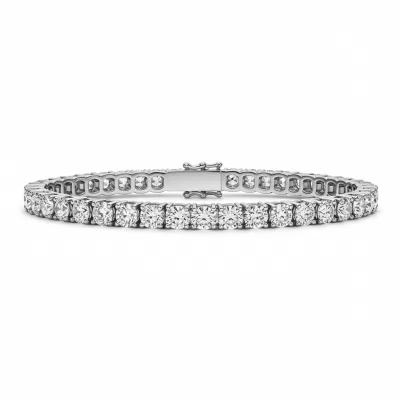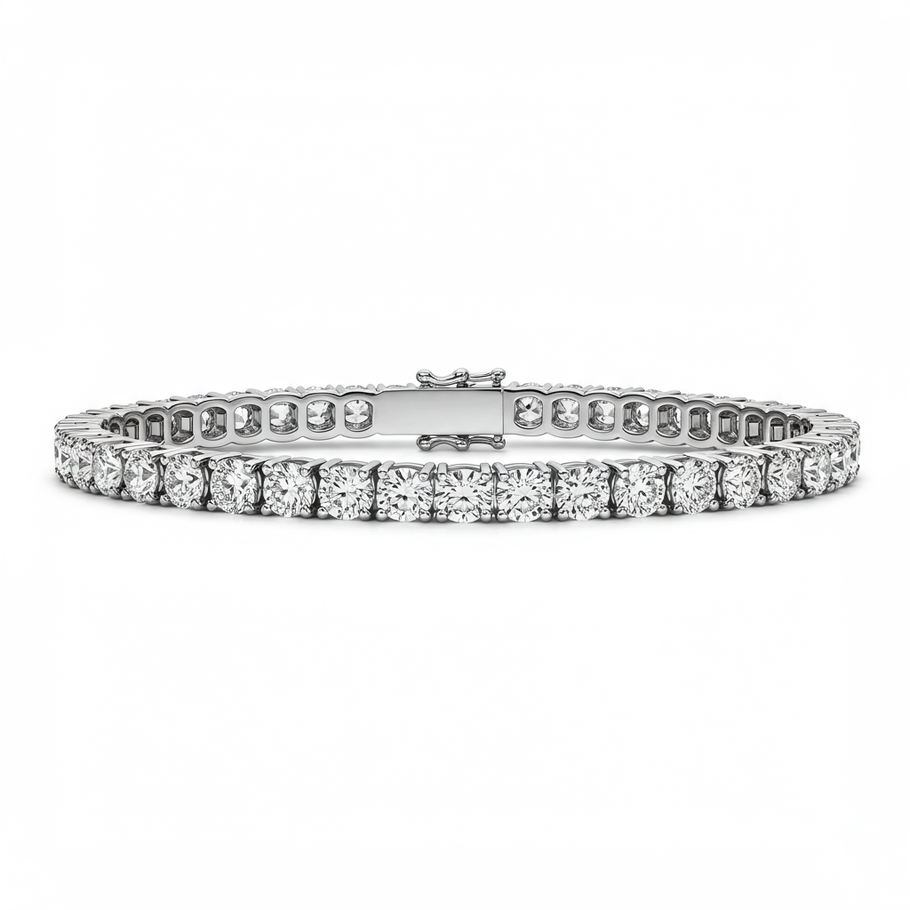 The ultimate symbol of effortless elegance, this classic diamond tennis bracelet features a continuous stream of perfectly matched, brilliant round diamonds. Each stone is meticulously secured in a low-profile four-prong setting, maximizing light return and fire. Crafted in radiant 18KT white gold, the fluid articulation and robust box clasp ensure both comfort and security for daily wear or grand occasions. This piece represents timeless luxury, making it an indispensable addition to any refined jewelry collection. It is certified for superior quality and craftsmanship.