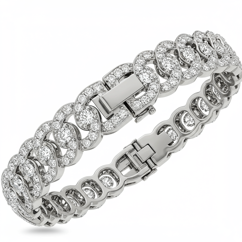 The yappy bracelets encapsulate sophisticated design with uncompromising brilliance. Each link is meticulously crafted in 18KT white gold, securing a continuous row of dazzling VVS diamonds in a streamlined, comfortable setting. This piece delivers timeless elegance, serving as the perfect signature accessory for any occasion. Its flexible construction ensures a comfortable wear while promising enduring luxury and exceptional sparkle.
