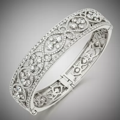 Embrace timeless elegance with this iconic 18KT white gold diamond cuff bracelet. Meticulously crafted, the piece showcases a continuous line of brilliant-cut VVS diamonds that capture and reflect light with dazzling intensity. Its sophisticated hinge mechanism ensures both security and effortless wearability, making it a perfect statement accessory for any elevated occasion. This design embodies luxurious artistry and enduring style, suitable for the discerning modern woman.