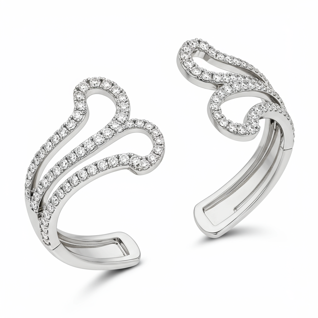 The e Newton Bracelet embodies modern minimalism and profound elegance, designed as an architectural cuff that wraps the wrist effortlessly. Crafted in luminous 18KT white gold, this piece features perfectly aligned rows of VVS diamonds, catching light from every angle. Its structured yet fluid design offers superior comfort while making an unmistakable statement of contemporary luxury. This bracelet is an essential cornerstone for the sophisticated jewelry collector.