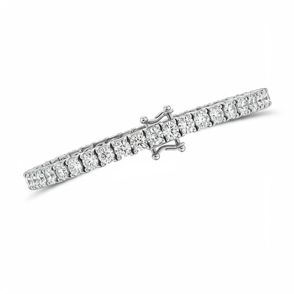 This elegant silver bracelet for women features a continuous stream of brilliant round-cut diamonds, perfectly set in highly polished 18KT white gold. Designed for supreme comfort and flexibility, this tennis bracelet drapes exquisitely around the wrist, catching light from every angle. Each diamond is selected for its superior VVS clarity and G color, guaranteeing breathtaking sparkle. A secure box clasp ensures reliable wear, making this piece the ultimate statement of timeless luxury.